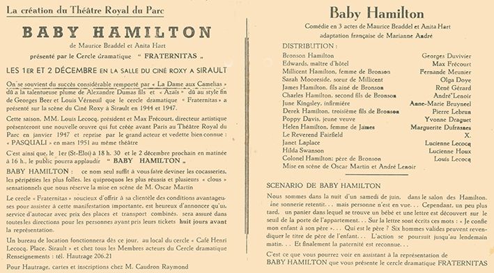 C’est dans un esprit entièrement renouvelé de fraternité et de camaraderie que « Fraternitas » présente, les 1er et 2 décembre 1951, le grand succès du Théâtre du Parc de Bruxelles, Baby Hamilton.