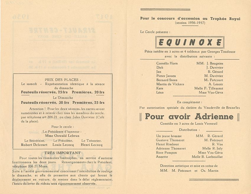Le mois de mars 1945 est également marqué par une perte douloureuse : M. Adelson Briffeuil, président du cercle depuis sa création et aussi acteur fantaisiste et chansonnier apprécié, s’éteint après une longue maladie. En son honneur, M. Oswald Lebrun lui succède à la présidence et partage désormais la direction avec M. Jules Leclercq, consolidant ainsi la gouvernance du cercle.