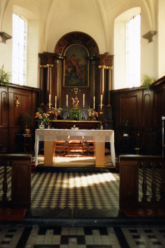 Derrière le chœur, une pierre gravée témoigne encore du passé : on peut y lire l’inscription « Loué soit le Saint Sacrement 1732 ». Juste à côté, un auvent adossé au mur extérieur rappelle l’existence ancienne d’un calvaire. On y distingue encore les traces d’une croix et, de chaque côté, celles de deux statuettes. Il s’agit sans doute de la grande croix aujourd’hui suspendue dans le porche, accompagnée des statues de Marie et de Jean. Ce calvaire disparu vers 1850 fut vraisemblablement remplacé par les calvaires Quennesson et d’Antoing, construits à la même époque.