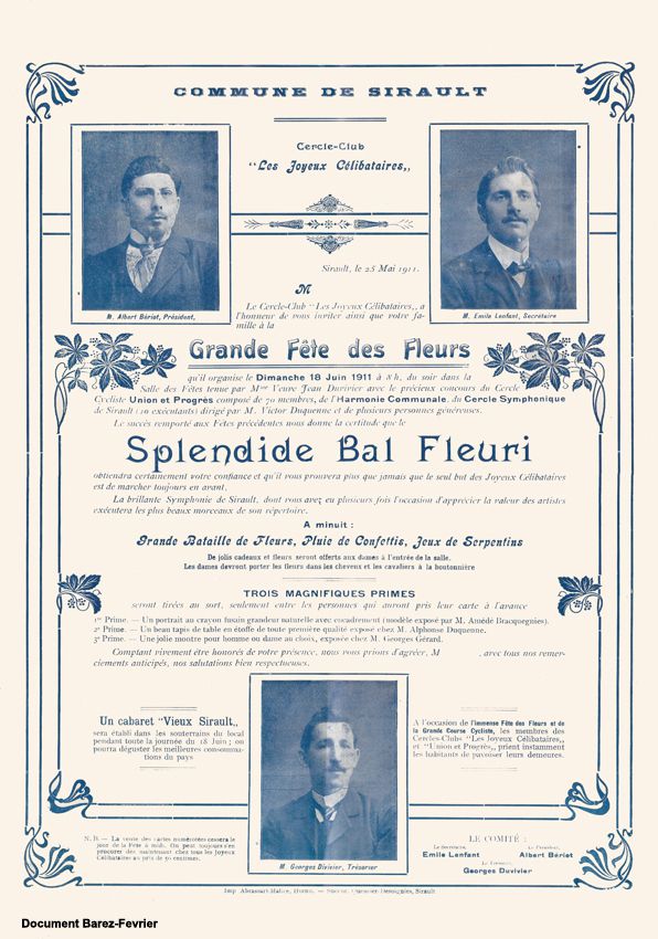 Ce cercle connut rapidement un succès considérable, devenant un rendez-vous incontournable pour la communauté locale. Son objectif principal était d’organiser des bals-concerts animés par des chants et des musiques entraînantes, apportant ainsi une ambiance festive et conviviale à Sirault. Pour mener à bien leurs activités, ils s’entourèrent d’un groupe de collaborateurs fidèles et talentueux, parmi lesquels figuraient Messieurs Émile Galand, Jules Duquenne — connu sous le surnom affectueux d’"el grand Dérique" — Sylva Durieu, Jules Culem, Adelson Briffeuil, Maurice Duvivier, Oswald Lebrun, Gustave Deblecker, Georges Lenoir, et bien d’autres encore.