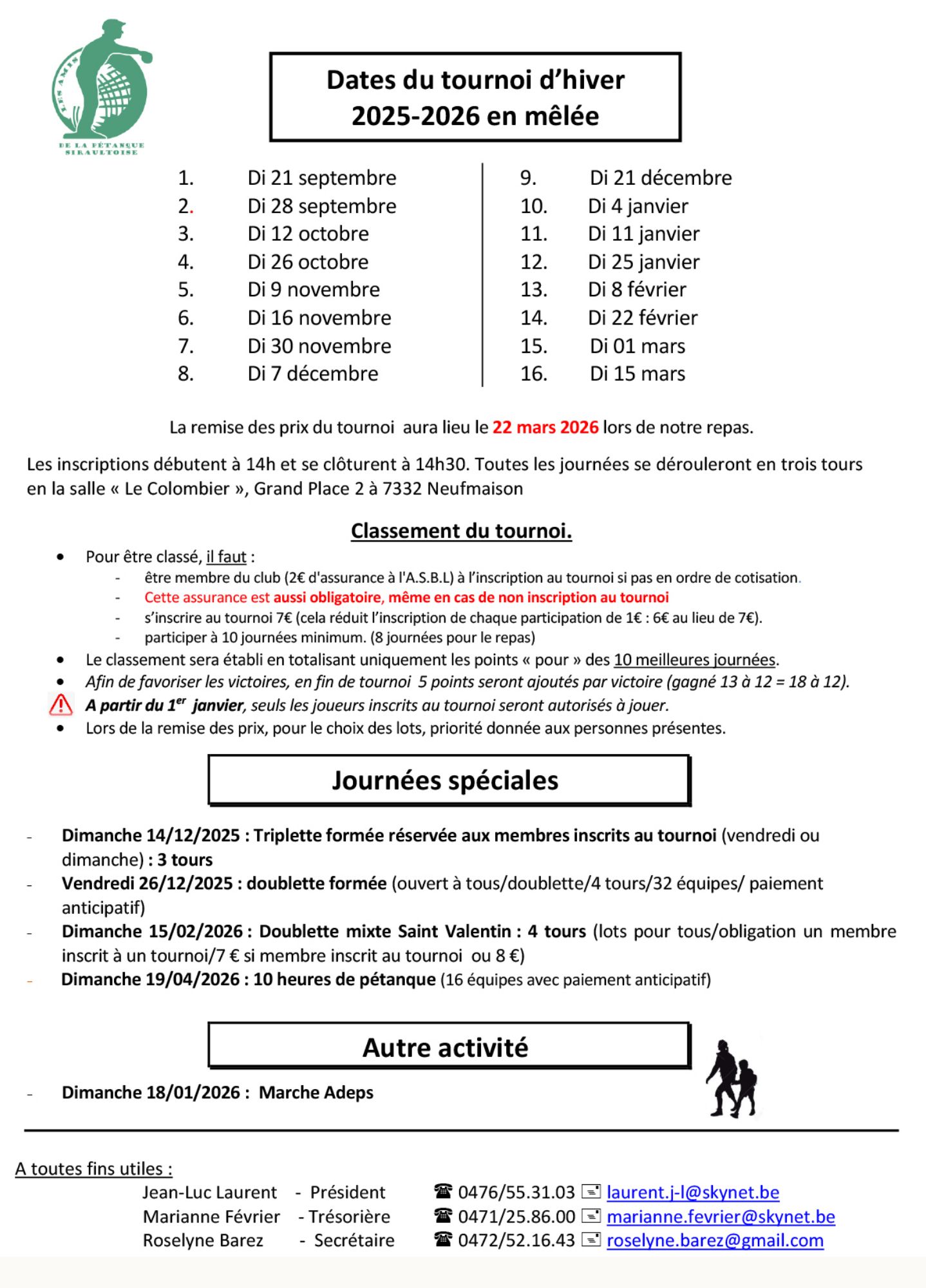 Dates du tournoi d'hiver 2025-2026